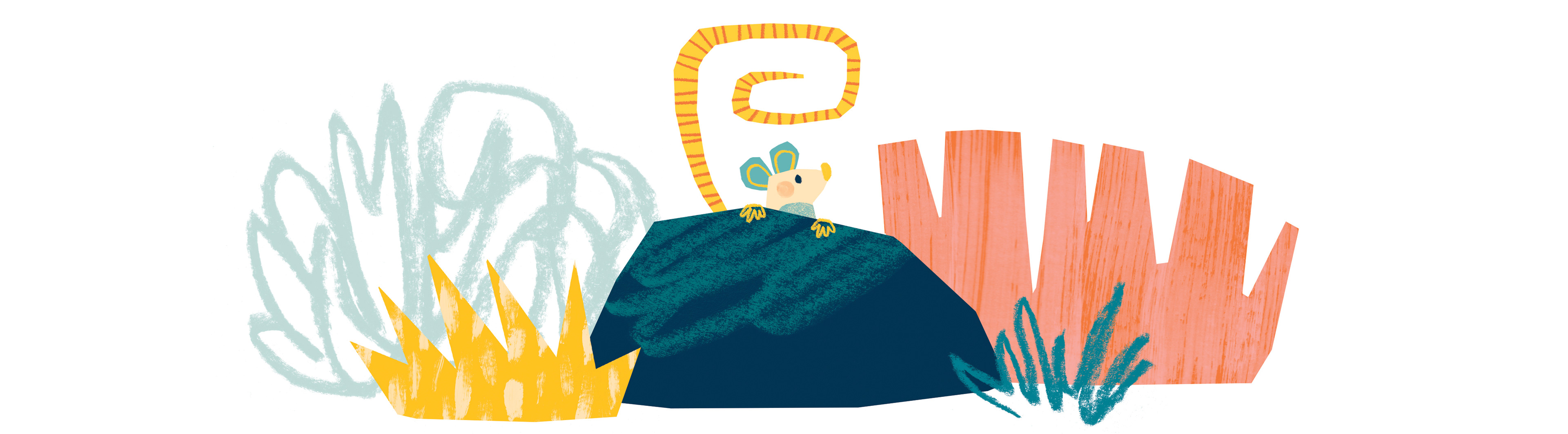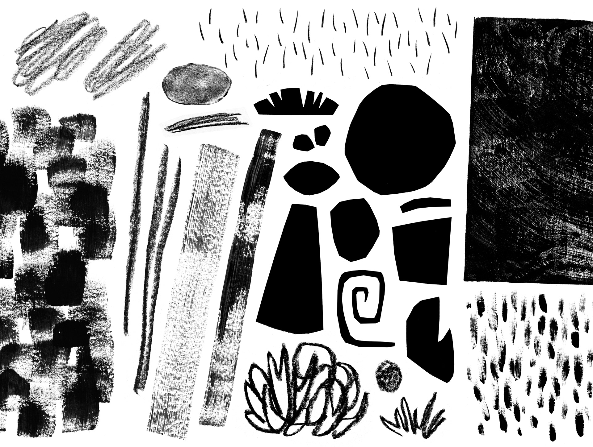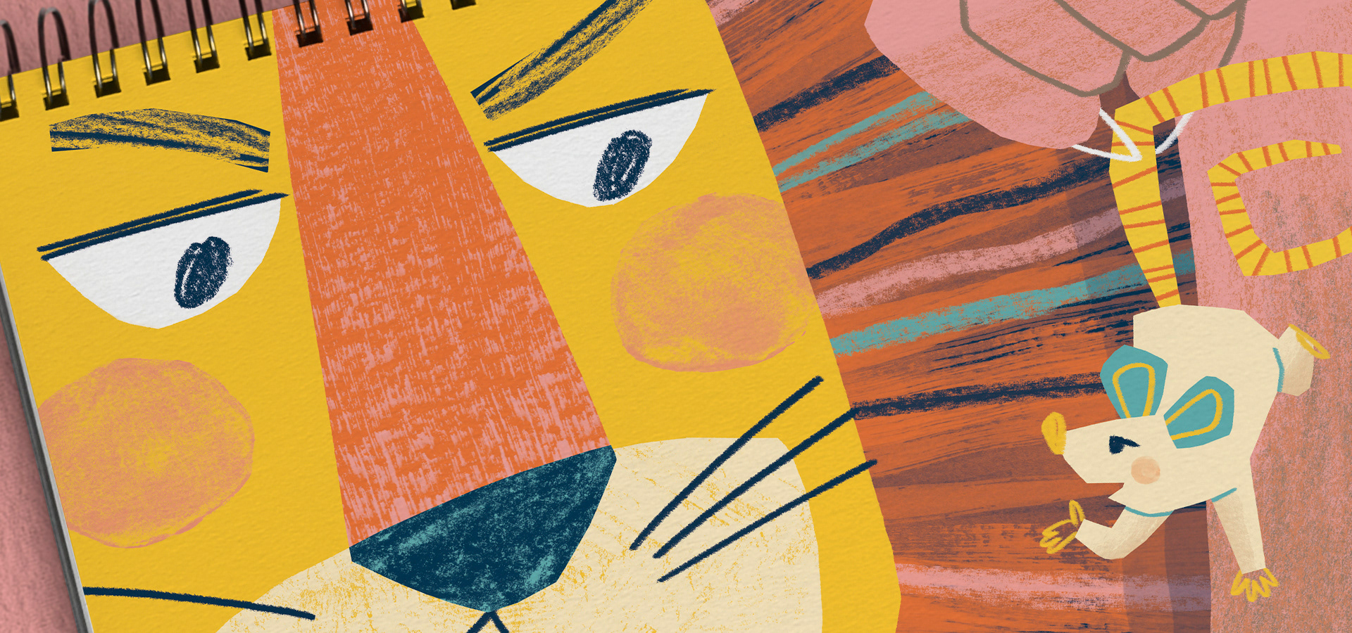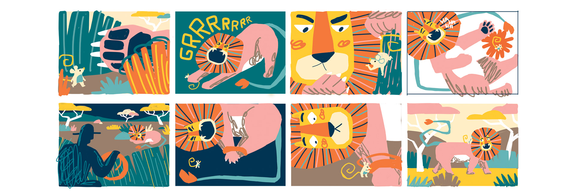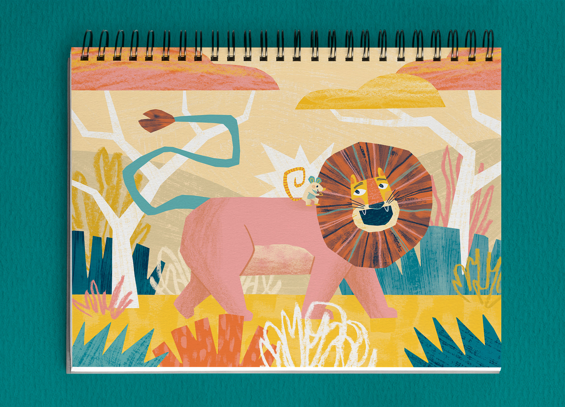 I created the illustrations for the fable “The Lion and the Mouse”, as well as additional illustrations designed to be cut out and used in classroom activities. The illustrations were developed through digital collage, using handmade elements that were digitized and produced with cutouts, pencil, charcoal, ink, and stamps.